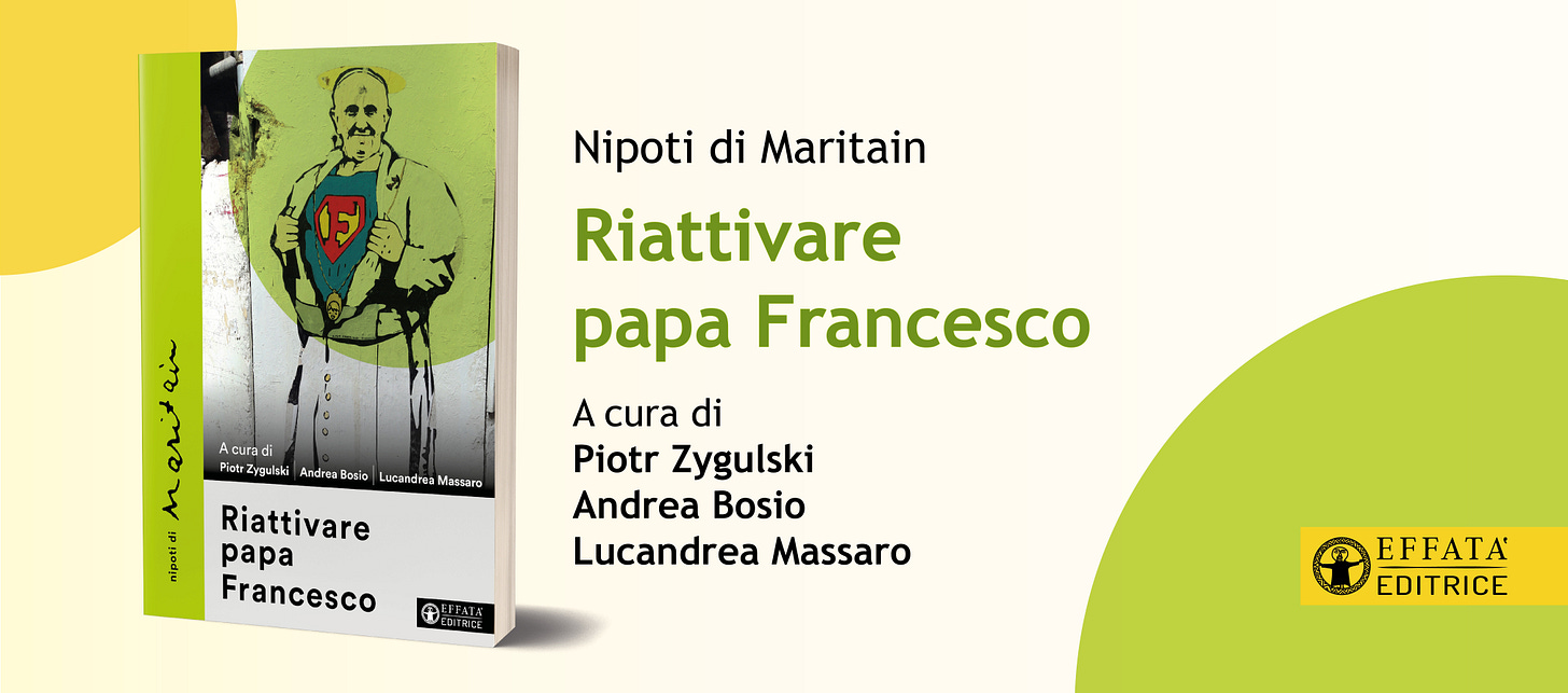 Con Lucandrea Massaro e Piotr Zygulski abbiamo curato un volume sul pontificato di Francesco riletto - riattivato! - a un anno dalla morte, unendo contributi di altissimo livello e interviste ad alcuni dei maggiori esperti internazionali. Fa parte dei progetti editoriali di una realtà associativa con cui collaboro da un decennio, Nipoti di Maritain, e anche questa volta ci porta in libreria Effatà editrice (la stessa con cui ho scritto di don Minzoni). Sul volume, ha scritto la sua puntata domenicale Lucandrea; per chi l’avesse persa, eccola qui.